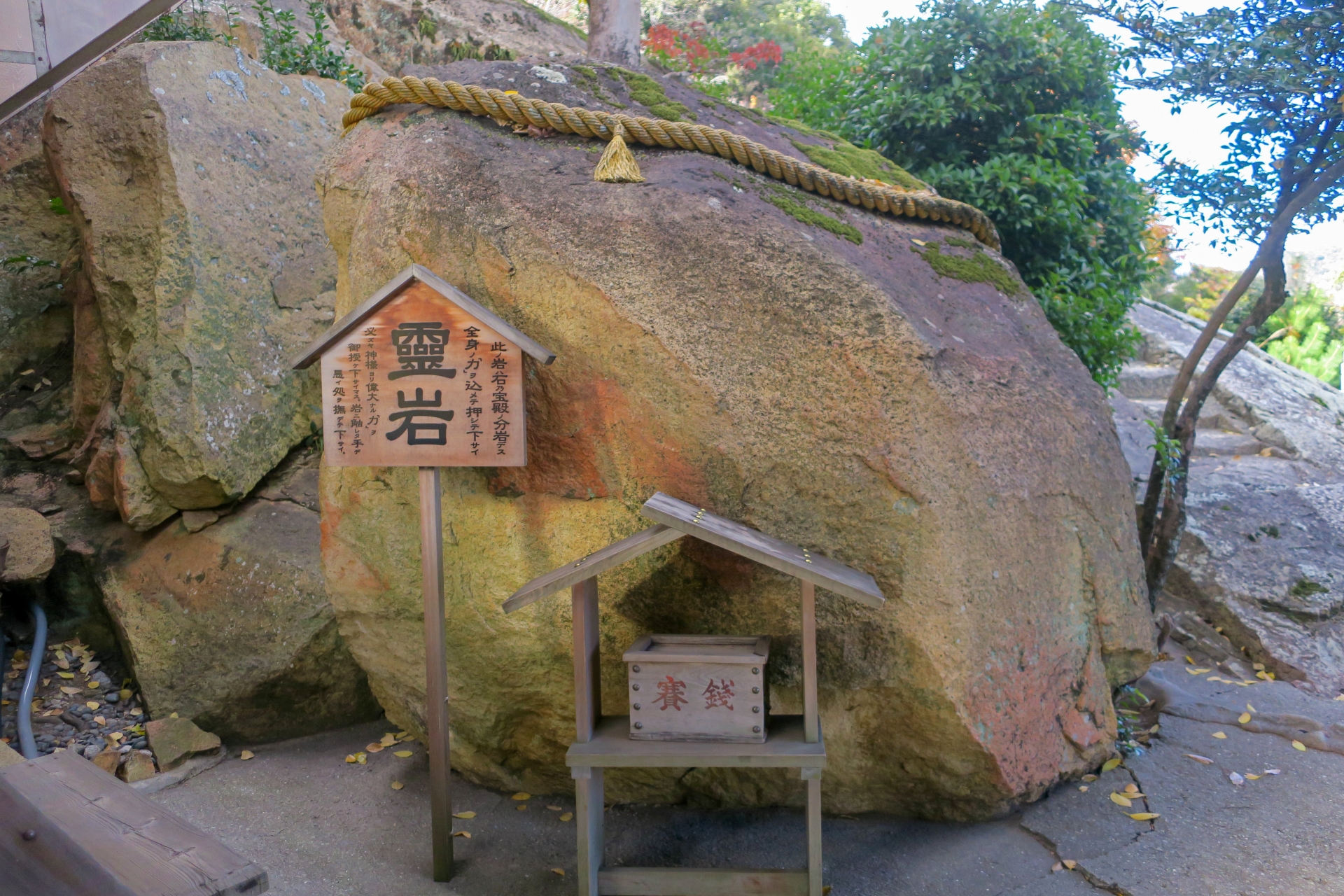 御神体の横に分石の「霊岩」があり、全身の力を込めて霊岩を押した手で、体の弱いところを撫でると、病気平癒の御利益がある信仰されています。