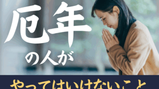 厄年 厄払い 厄年にやってはいけないこと・避けるべきことは?NG行動と過ごし方の注意点を詳しく解説 厄年は災難・不運に遭遇する可能性が高まる年齢であり、厄年の人は1年間慎重な行動を心がける必要があると信じられてきました。実際に厄年は、身体の変化が生じたり、人生の転換期を迎える時期に当たやすく、心身に不安を感じたり、調子を崩しやすい年齢でも... 2025.10.01 厄年 厄払い